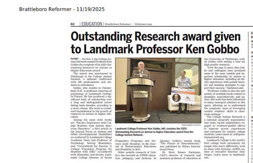 - “Professor Emeritus Ken Gobbo Named College Autism Network Researcher of the Year” (Landmark College)