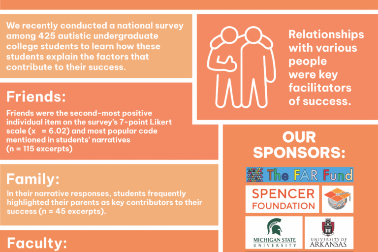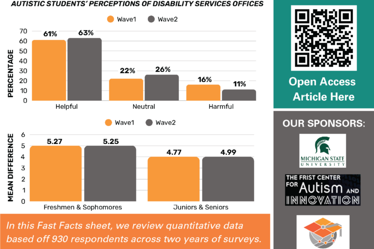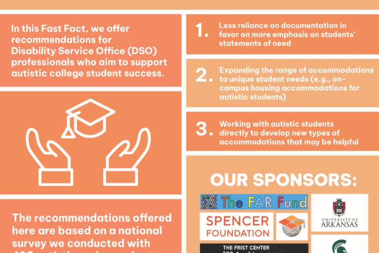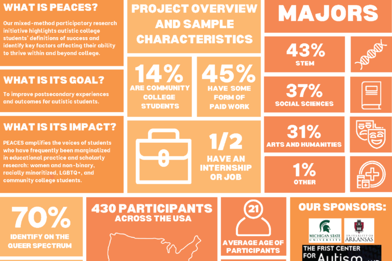 View/Download PDF PEACES Fast Fact #18: Methodology: We conducted a national survey among 430 autistic undergraduate students in Fall 2022…