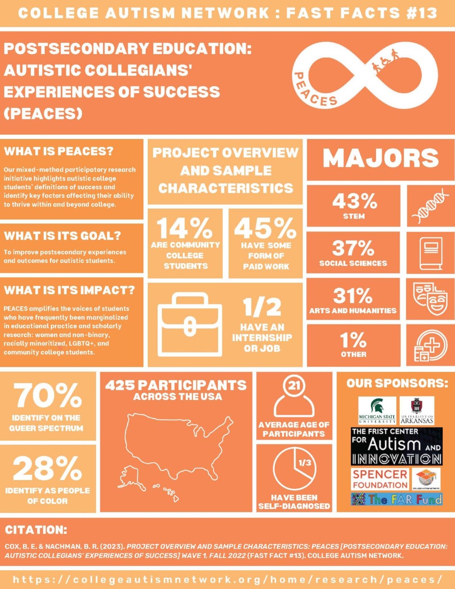 Source: COX, B. E. & NACHMAN, B. R. (2023). PROJECT OVERVIEW AND SAMPLE CHARACTERISTICS: PEACES [POSTSECONDARY EDUCATION: AUTISTIC COLLEGIANS’ EXPERIENCES OF SUCCESS] WAVE 1, FALL 2022 (FAST FACT #13). COLLEGE AUTISM NETWORK.