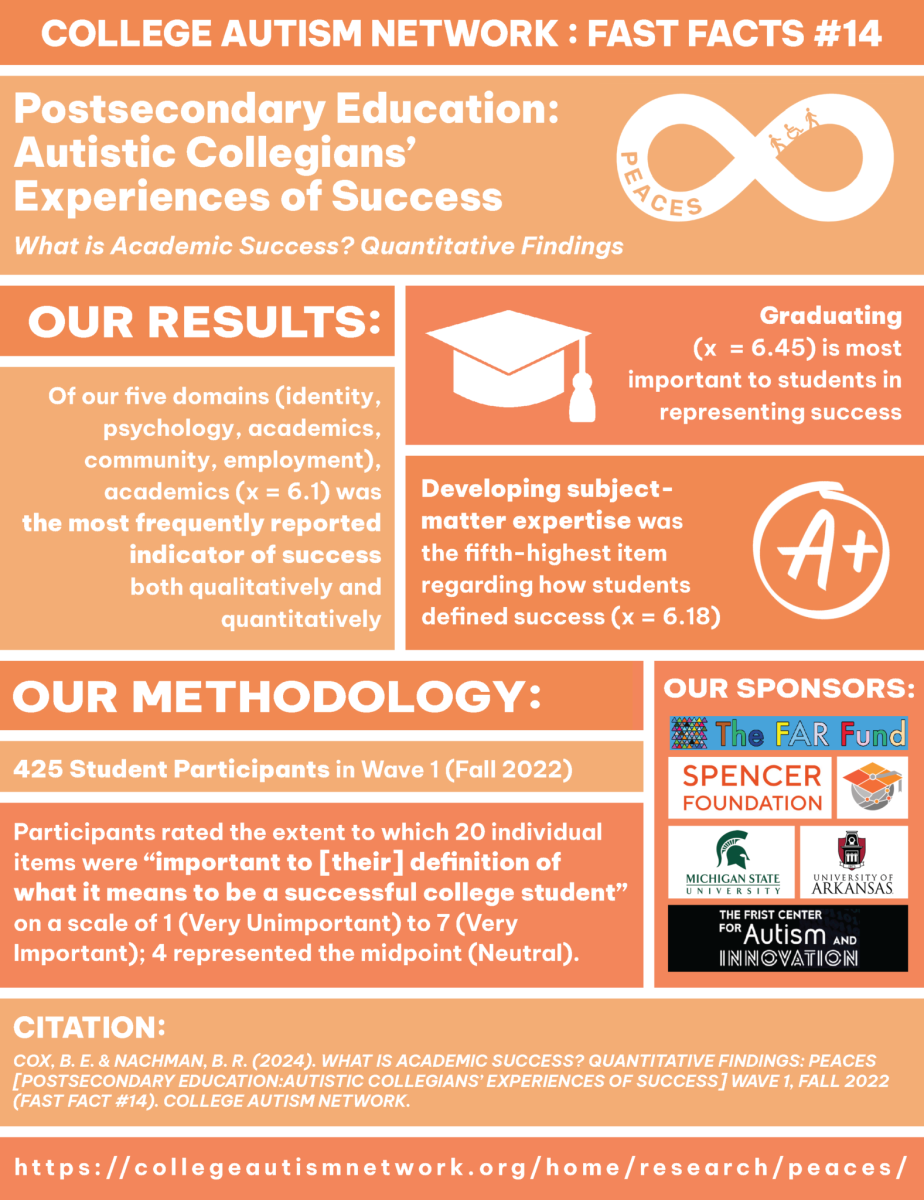 Source: COX, B. E. & NACHMAN, B. R. (2024). WHAT IS ACADEMIC SUCCESS? QUANTITATIVE FINDINGS: PEACES [POSTSECONDARY EDUCATION:AUTISTIC COLLEGIANS’ EXPERIENCES OF SUCCESS] WAVE 1, FALL 2022 (FAST FACT #14). COLLEGE AUTISM NETWORK.