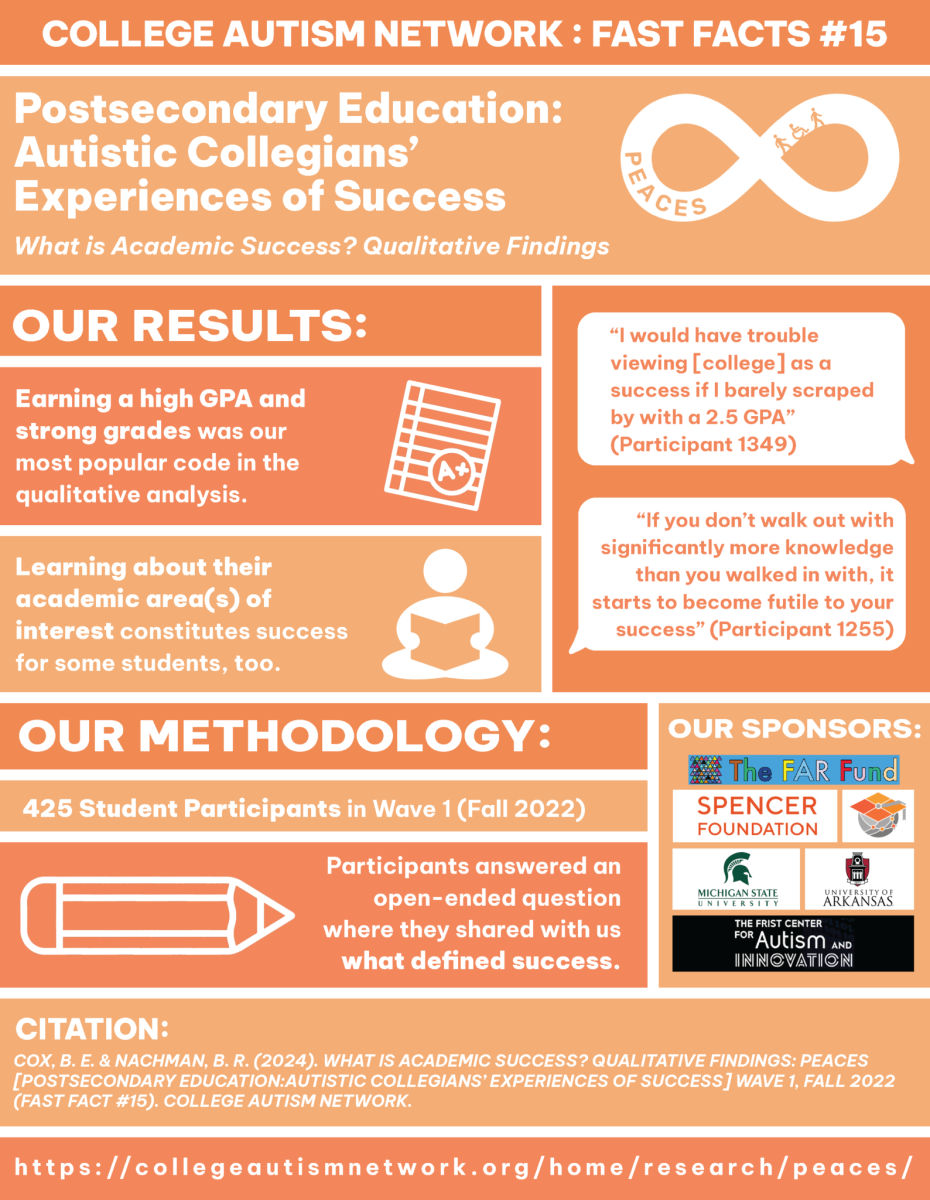 Source: COX, B. E. & NACHMAN, B. R. (2024). WHAT IS ACADEMIC SUCCESS? QUALITATIVE FINDINGS: PEACES [POSTSECONDARY EDUCATION:AUTISTIC COLLEGIANS’ EXPERIENCES OF SUCCESS] WAVE 1, FALL 2022 (FAST FACT #15). COLLEGE AUTISM NETWORK.
