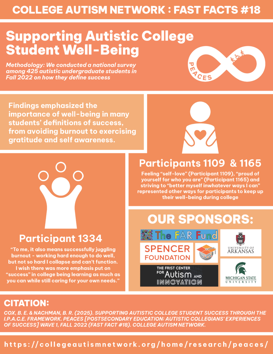 Source: COX, B. E. & NACHMAN, B. R. (2024). SUPPORTING AUTISTIC COLLEGE STUDENT SUCCESS THROUGH THE I.P.A.C.E. FRAMEWORK. PEACES [POSTSECONDARY EDUCATION: AUTISTIC COLLEGIANS’ EXPERIENCES OF SUCCESS] WAVE 1, FALL 2022 (FAST FACT #18). COLLEGE AUTISM NETWORK.