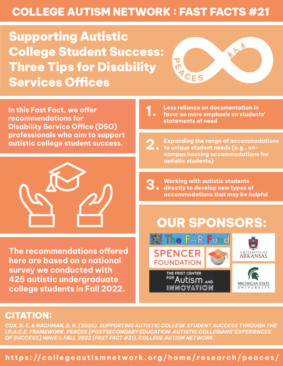 COX, B. E. & NACHMAN, B. R. (2024). SUPPORTING AUTISTIC COLLEGE STUDENT SUCCESS THROUGH THE I.P.A.C.E. FRAMEWORK. PEACES [POSTSECONDARY EDUCATION: AUTISTIC COLLEGIANS’ EXPERIENCES OF SUCCESS] WAVE 1, FALL 2022 (FAST FACT #21). COLLEGE AUTISM NETWORK.